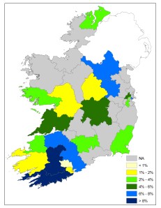 Given Fine Gael’s successes at General Election 2011, there are a number of constituencies where party seats would be vulnerable even with small percentage swings away from the party to opponents. The earlier post on constituency marginality outlines some of these cases, which include a number of especially vulnerable constituencies for Fine Gael where a swing of under 2% away from the party would see it lose seats. Constiuencies that would fall into this category would include Carlow-Kilkenny, Cyavan-Monaghan, Cork North-West, Dublin Mid West, Dublin North, Dublin South, Galway West, Louth and Meath West.