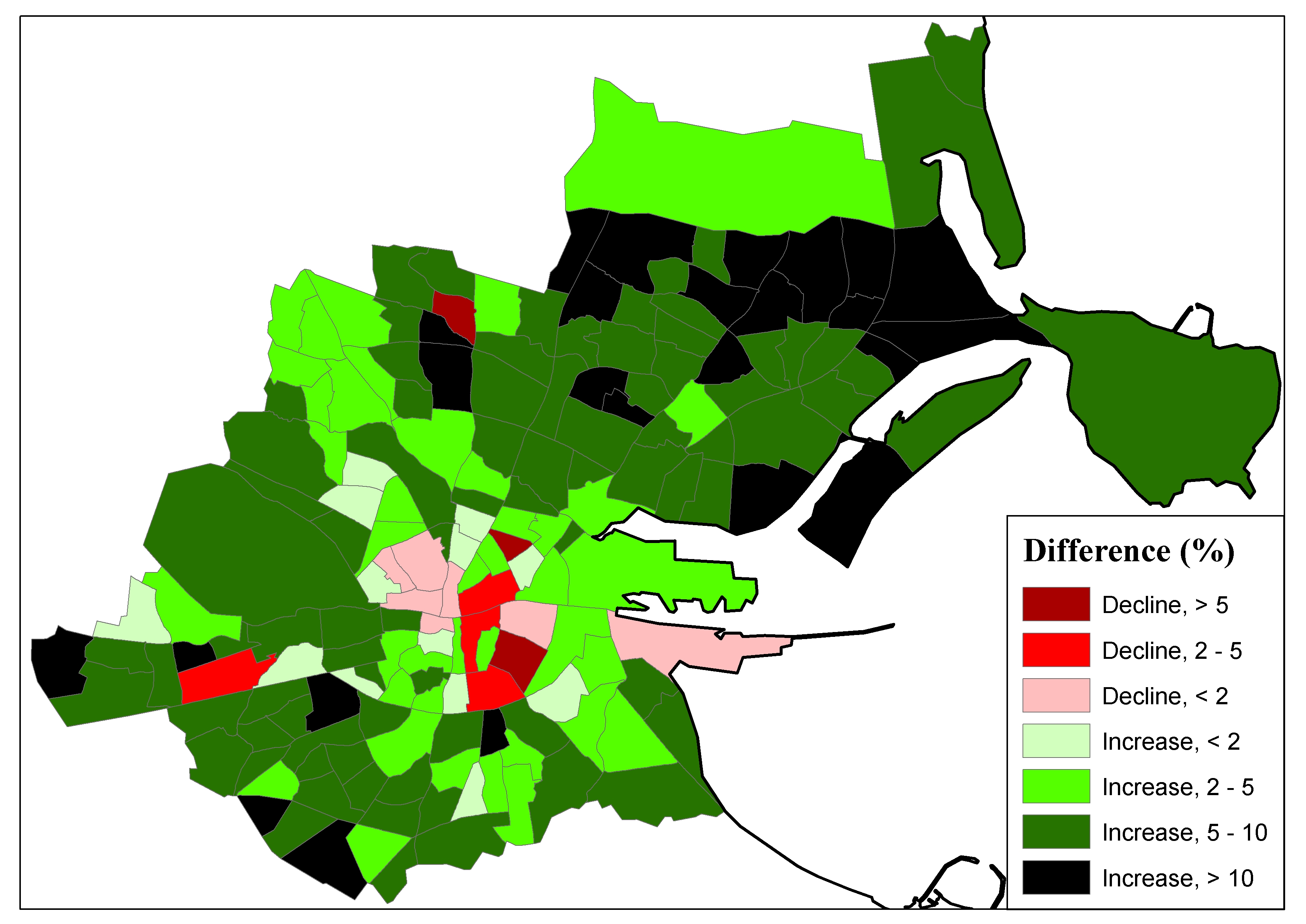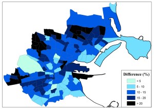 Turnout differences, by electoral division, between the 2007 and 2011 General Elections in the Dublin City consituencies area