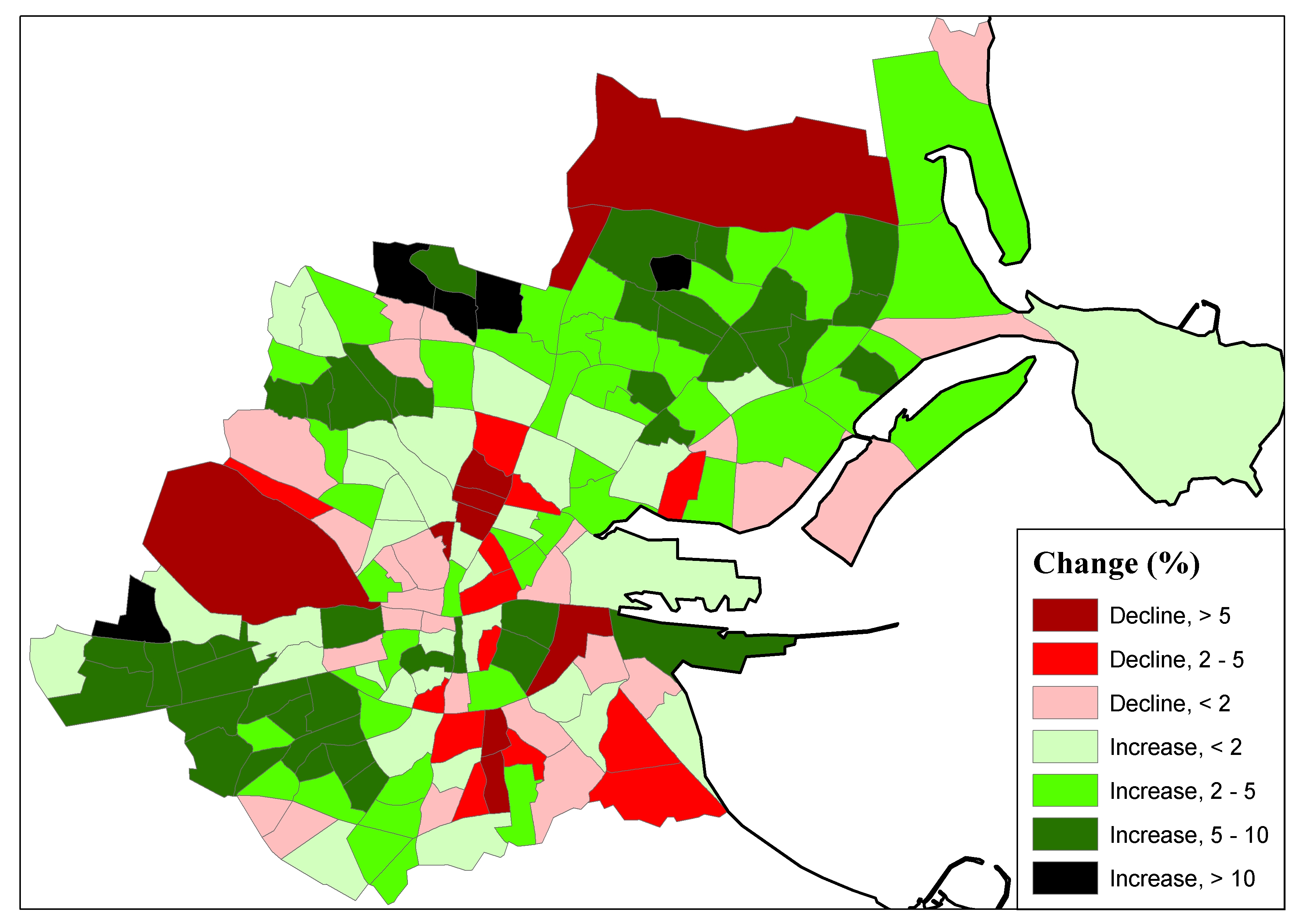 Turnout change, by electoral division, in the Dublin City constituencies area between the 2002 and 2007 General Elections.