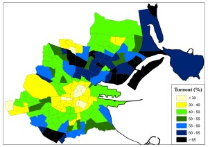 • Yes, that’s an important point to make and should in fairness have been stressed in the initial post. While there are issues with electoral register accuracy across the state, these are perhaps most prevalent in the inner city area given the high levels of residential mobility characterising this area, as you’ve noted above. Another point to add is that my researches have shown the electoral register in the inner city to be significantly under-estimated: there are significantly fewer people on the inner city registers than are numbered in the valid adult populations (i.e. population aged 18, and above) for these area. As such, the “real” turnout levels in the inner city are much lower in fact that the reported voter turnout levels as covered in this post.