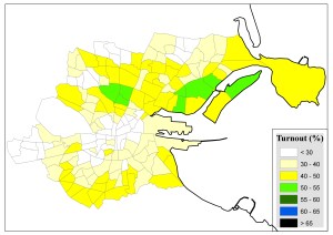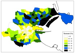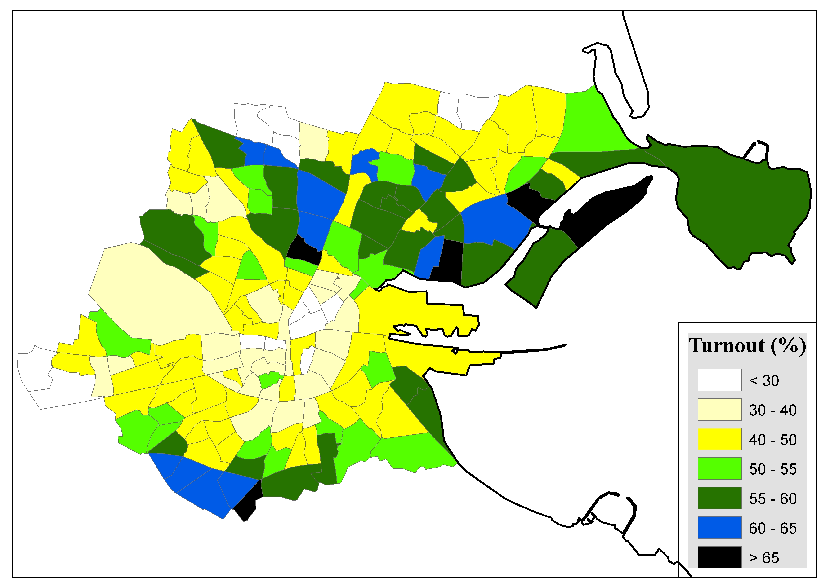 Figure 1: Voter turnout by electoral division in the Dublin City constitiencies for the 2001 Nice Treaty referendum.