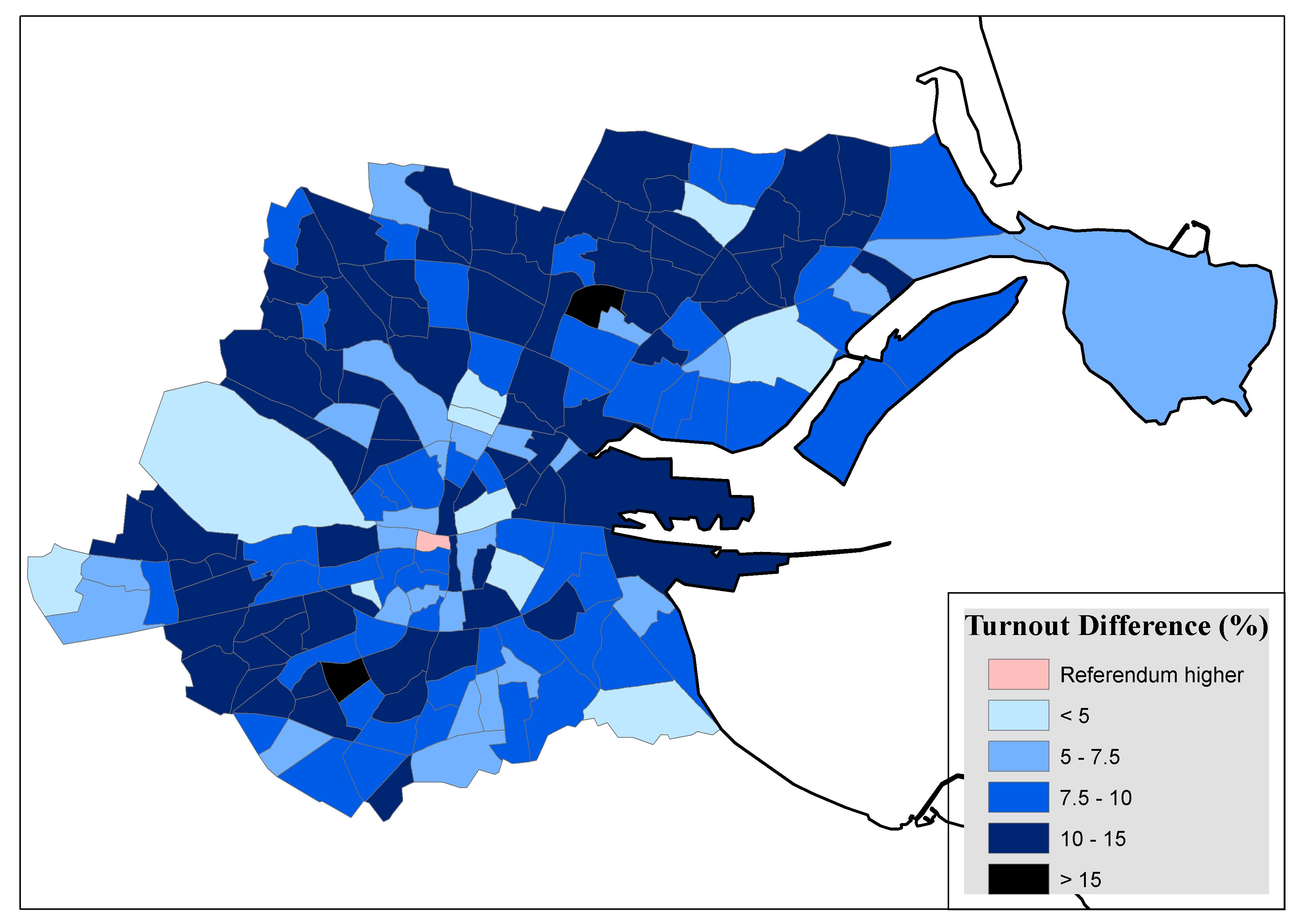 Figure 5: Turnout differences by electoral division between 2011 General Election and the 2009 Lisbon Referendum within the Dublin City constituencies