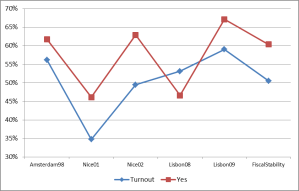 Figure 1: Percentage turnout and share of the vote won by the Yes side in European Union Treaty referendum elections, 1998-2012