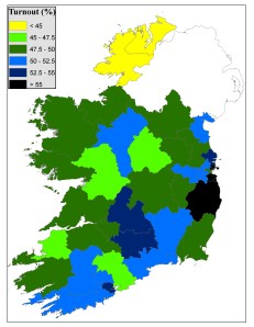 The highest turnout levels were again recorded in the more middle class Dublin constituencies (Figure 2b), with lower than average turnout levels recorded in a number of rural constituencies (Figure 2a) and with the lowest turnout levels again being registered in the two Donegal constituencies. Turnout levels in Dublin (average of 53.4%) were significantly higher than in the rest of the state (49.6%), with average turnout levels of 50.4% in both Leinster and Munster but a low average turnout of 47.2% for the Connacht-Ulster region. As noted in the previous post, this is more or less the mirror image of the turnout patterns usually associated with local and general elections but it is in keeping with the general geography of turnouts for referendum elections.