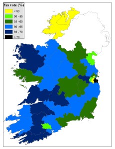 The region with the highest Yes vote in percentage terms was Munster (62.3%) with the lowest share being recorded in Connacht-Ulster (58.2%). The level of support for the referendum was slightly higher than the national average in Dublin (60.5%), but very significant differences existed between the level of support for the referendum in the more middle class constituencies (70.0%) than in the more working class constituencies (49.6%).