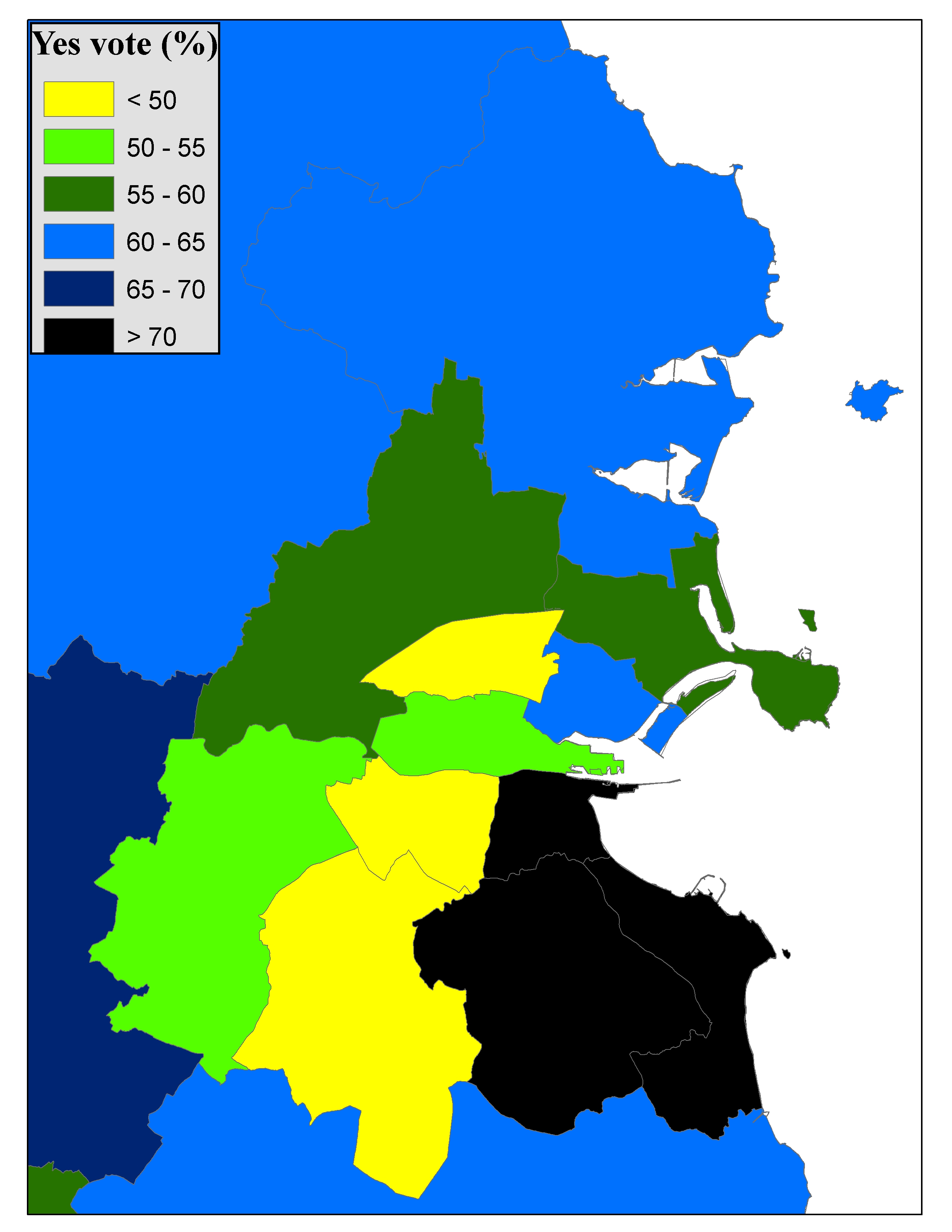 Figure 2d: Percentage share of the vote won by the Yes side in the 2012 European Union Fiscal Stability treaty referendum (Dublin region)