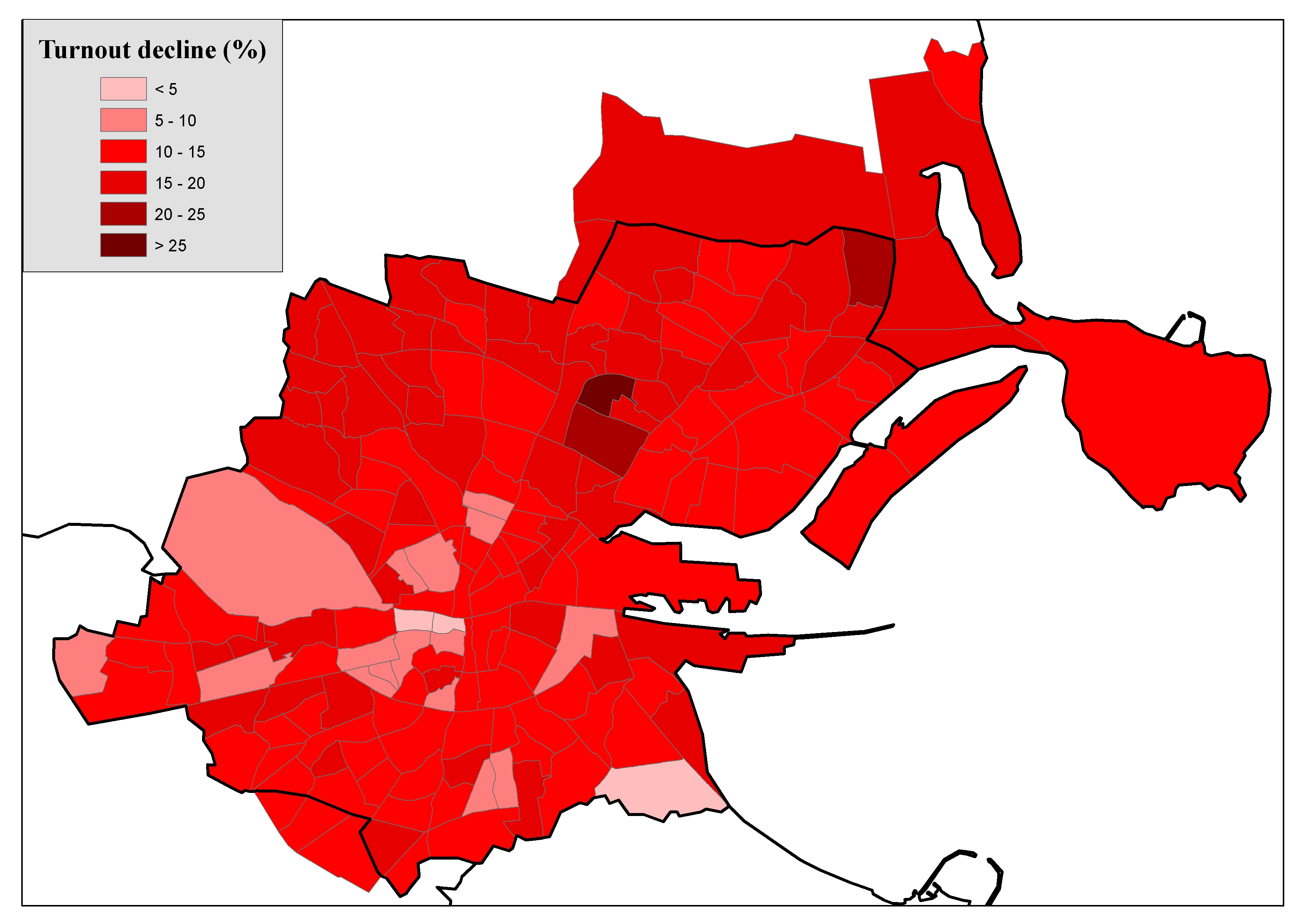 Figure 4: Turnout decline (%) by electoral division between the 2011 General Election and 2012 Fiscal Stability Treaty Referendum in the Dublin City constituencies area