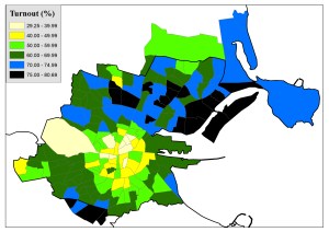 As someone who has been interested in the area of voter turnout since commencing PhD researches on this topic back in…gulp…1999 and as a geographer, I am always interested in attaining turnout data for very small areas/at a sub-constituency level. While constituency level turnout analysis/maps can uncover interesting trends and point towards certain factors impacting on these, there are however only a small number of these (forty-three general, or Dail, election constituencies at presenting, falling to forty following the next general election) meaning that any analyses of turnout at this level faces issues to do with small-numbers problems. It is also the case that the really interesting turnout geographies occur usually at the sub-constituency level and there can be significant variations in turnout levels within a single constituency – analyses of such geographies/trends can offer a deeper understanding of what factors are shaping/influencing turnout propensity and can add to/complement individual level studies of turnout behaviour engaged in by those in the field of political science.