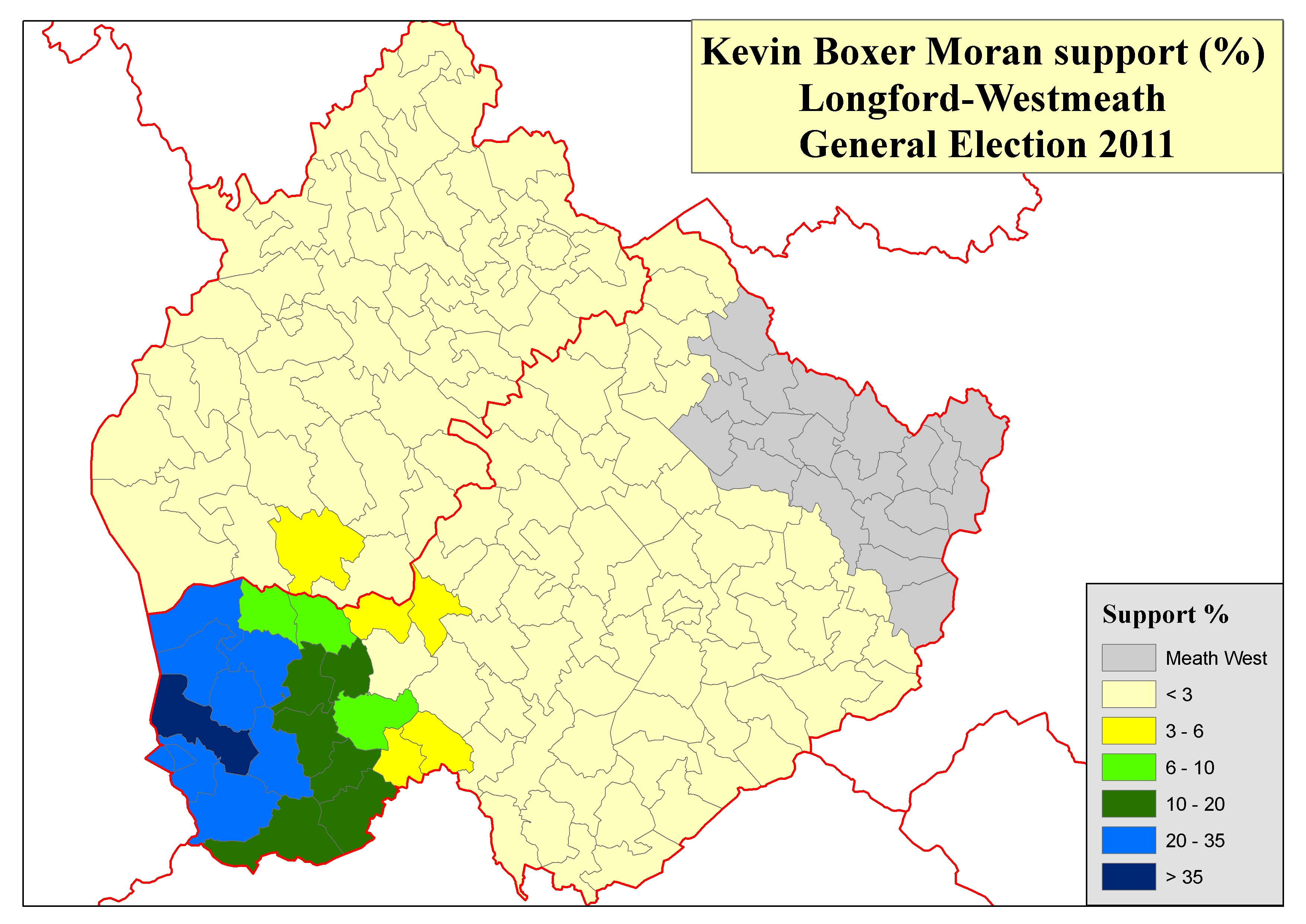 Figure 1: Support levels for Kevin “Boxer” Moran at the 2011 General Election (based on analysis by Adrian Kavanagh of tally figures published in local newspapers after the election)