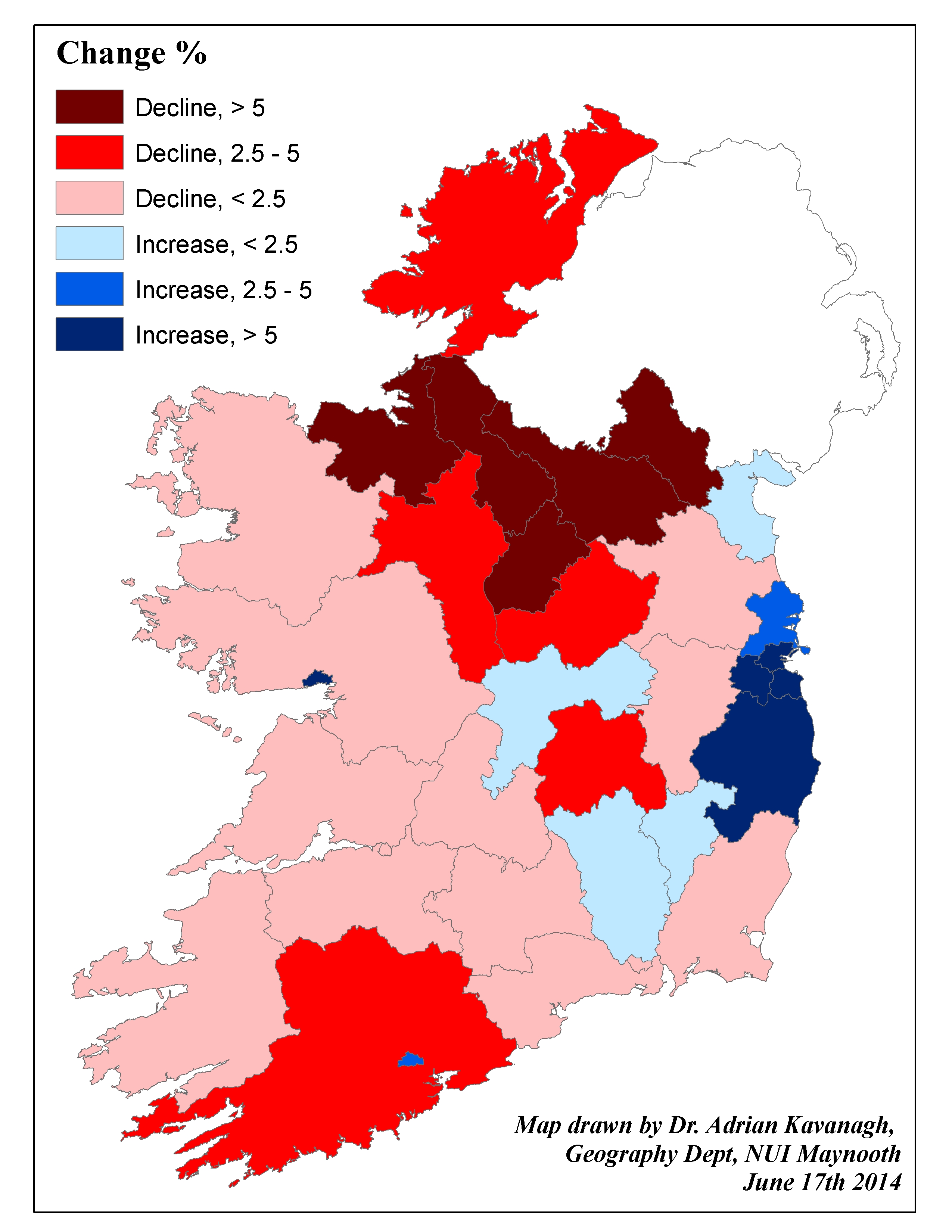 Indeed the 2014 Local Elections would appear to represent the lowest ever local election turnout contest for a number of rural counties, but especially those located in the Border, West and Midlands regions (see Figure 3). Turnouts in 2014 were notably lower than in the low turnout 1999 contest in these counties. The biggest drop in turnout levels between 1999 and 2014 was in Monaghan, where turnout levels were 10.8% lower in 2014 than in 1999. Other counties experiencing notably lower turnout levels at the 2014 election than at the low turnout 1999 election included Sligo (decline of 7.5%), Leitrim (6.6%), Longford (6.1%), Cavan (5.2%) and….Nooooo!…Laois (4.1%). 2014 was indeed a record year for these counties in the wrong sense in terms of representing the lowest ever local election turnout levels in those counties’ histories, or at least the lowest ever local election turnouts in these counties over the past seven or eight decades. The other counties in which local election turnout levels were lower in 2014 than at the 1999 low turnout contest included Cork County (3.9%), Donegal (3.4%), Westmeath (2.8%), Roscommon (2.6%), Kerry County (2.1%), Mayo (1.6%), Tipperary (1.5%), Limerick (1.4%), Waterford (1.2%), Clare (1.0%), Meath (0.5%), Wexford (0.3%) and Galway County (0.1%). By contrast turnout levels were higher in 2014 than in 1999 in all of the Dublin local authority areas (see Figure 2), as well as in Cork City (4.0% higher) and Galway City (6.0%), as well as in the Dublin commuter belt counties of Kildare (1.7%), Louth (1.4%) and Wicklow (5.1%).