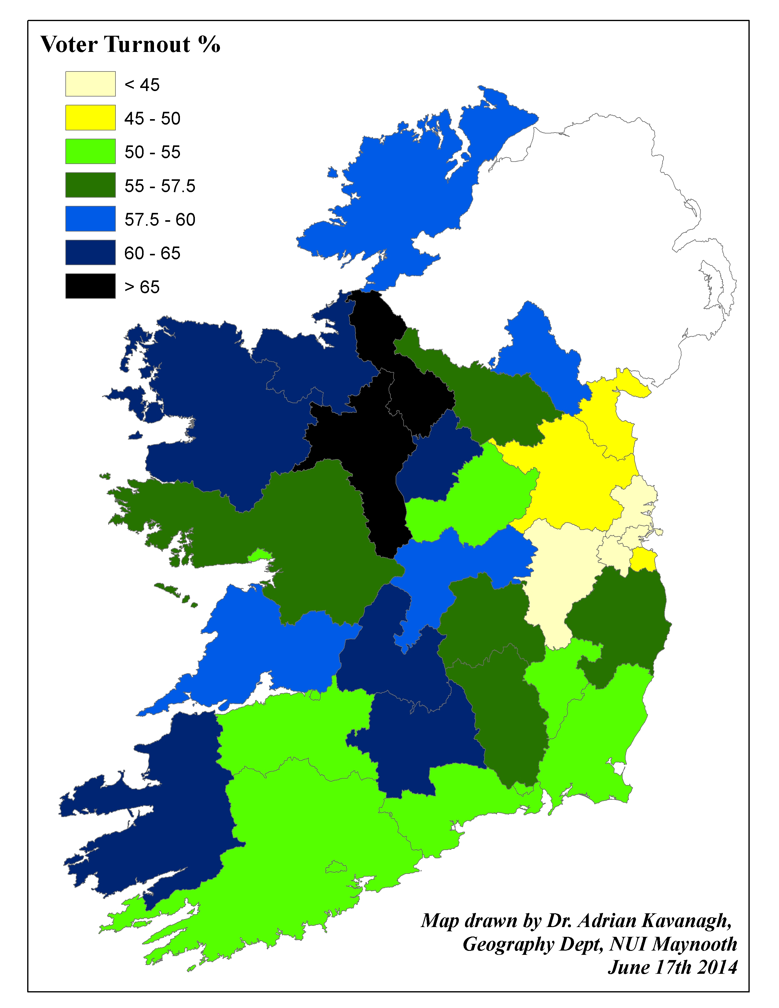 While rural-urban turnout differentials have narrowed notably since 1999, turnouts still tend to be notably higher in the more rural areas at local (and general) election contests (though not necessarily at referendum elections). At the local authority level, Figure 1 shows that the general turnout patterns at the 2014 elections were similar to those of previous local election contests, with higher turnout levels in the more rural parts of the state (as also illustrated by Figure 2) than in the more urban regions and with especially high turnout levels in the West and North-West regions, as well as the South West and South Midland regions to a lesser extent. The lowest turnout levels nationally, as Figure 1, illustrates, were associated with Dublin and its immediate commuter hinterland. At the local authority level, Leitrim yet again emerged as the county with the highest turnout level at a local election contest (67.0%), being followed closely by neighbouring Roscommon (65.4%) in this regard. Only a handful of other counties had turnout levels of greater than sixty percent at these elections, including Longford (63.7%), Tipperary (61.9%), Mayo (61.0%), Sligo (60.9%) and Kerry (60.5%). At the other extreme, the lowest turnout levels at the local authority level was recorded in South Dublin County (42.1%), Fingal County (42.2%) and Dublin City (42.8%), with the next lowest turnouts being associated with Kildare (44.7%), Meath (45.3%), Dun Laoghaire-Rathdown (45.6%) and Louth (49.3%).