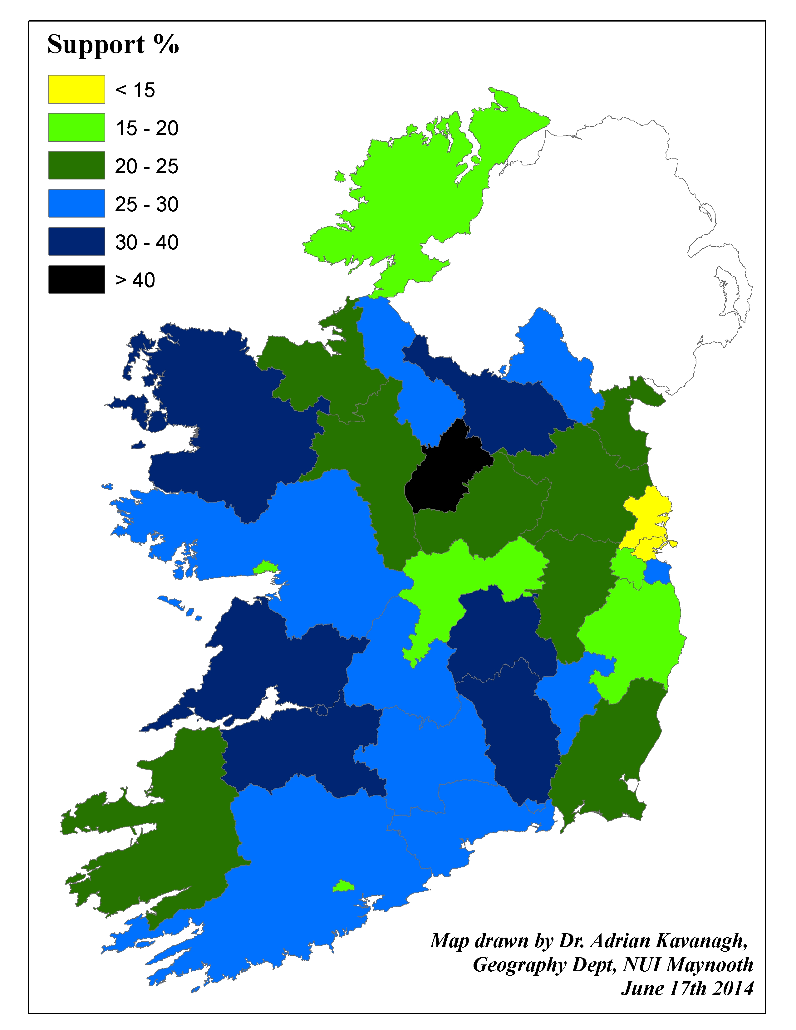 At the county/local authority level (see Figure 1 above), Fine Gael’s strongest electoral performance came in Longford, where the party won 42.1% of the total valid poll – this was the only county where Fine Gael succeeded in winning more than forty percent of the total valid poll at the 2014 elections. The party won between thirty and forty percent of the vote in a number of other counties, however, including Cavan (36.8%), Mayo (34.5%), Limerick (32.7%), Clare (31.5%), Laois (30.2%) and Kilkenny (30.0%). The party’s weakest electoral performances at the local authority level was associated with Dublin City (14.0%) and Fingal (14.7%), while Fine Gael also fell below twenty percent of the total valid poll in Donegal (15.7%), Galway City (15.8%), Offaly (17.3%), South Dublin County (18.0%), Cork City (19.0%) and Wexford (19.8%).