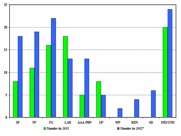 Figure 1: Number of female candidates by party/group at the 2011 election and selected/declared for the 2015/6 election (as of 3 Nov 2015)