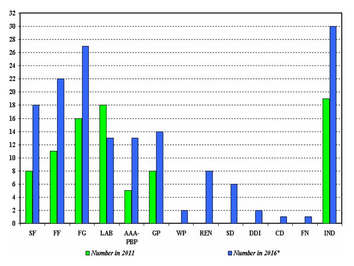 Figure 2: Number of female candidates by party/group at the 2011 election and selected/declared for General Election 2016 (as of 8th February 2016)