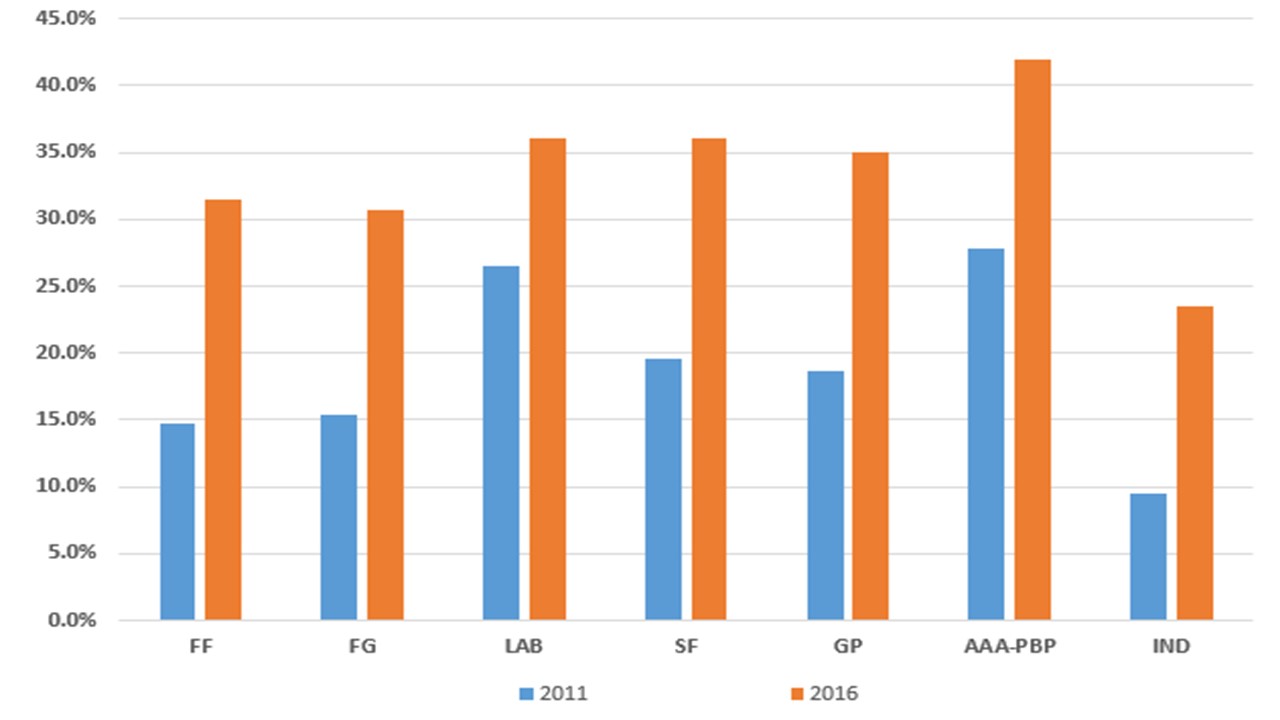 Figure 4: Comparison between female candidacy levels at the 2011 and 2016 General Elections
