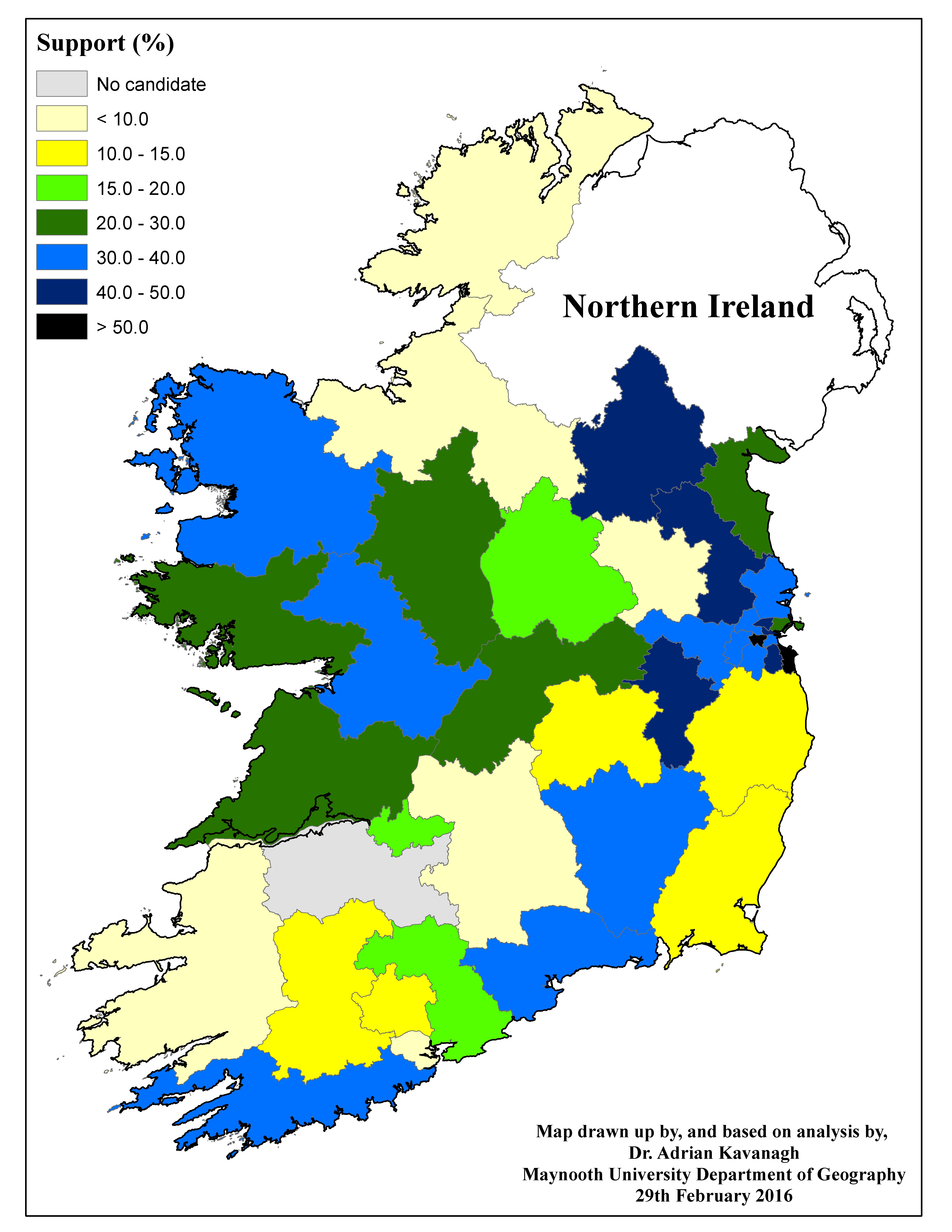 Figure 1: Percentage support for female candidates by Dail constituency, 2016 General Election