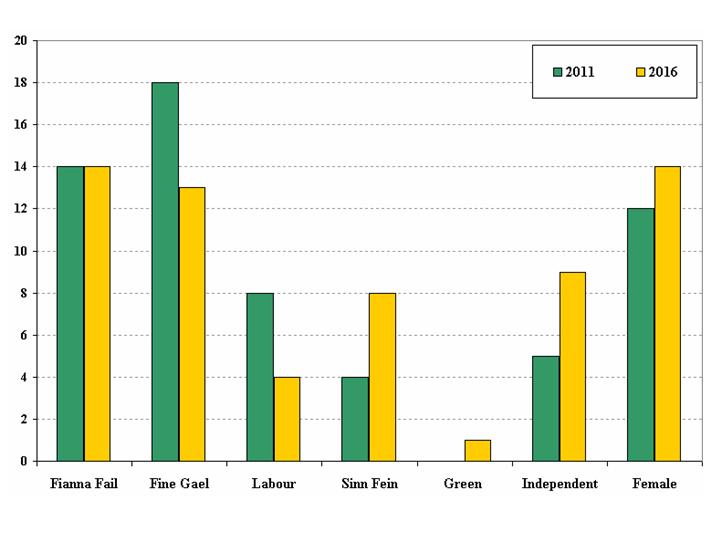 Figure 1: Number of seats won by political parties/groups and by female candidates at 2011 and 2016 Seanad Elections
