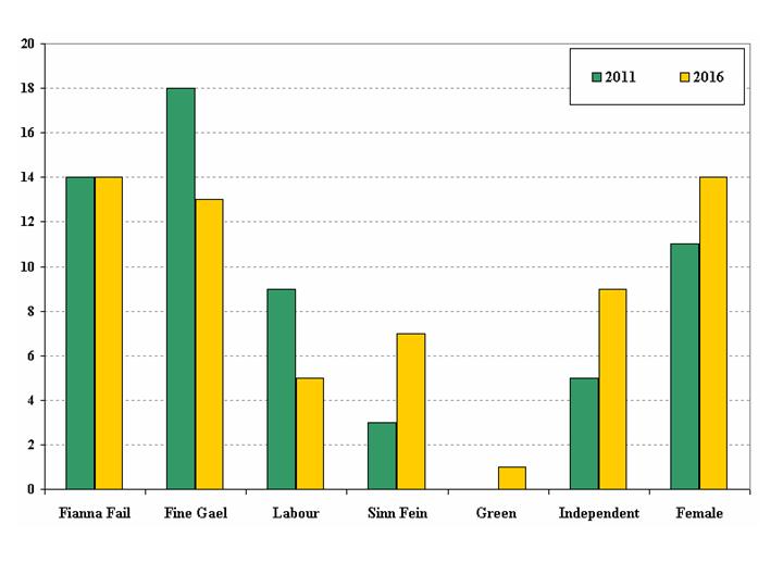 Figure 1: Number of seats won by political parties/groups and by female candidates at 2011 and 2016 Seanad Elections