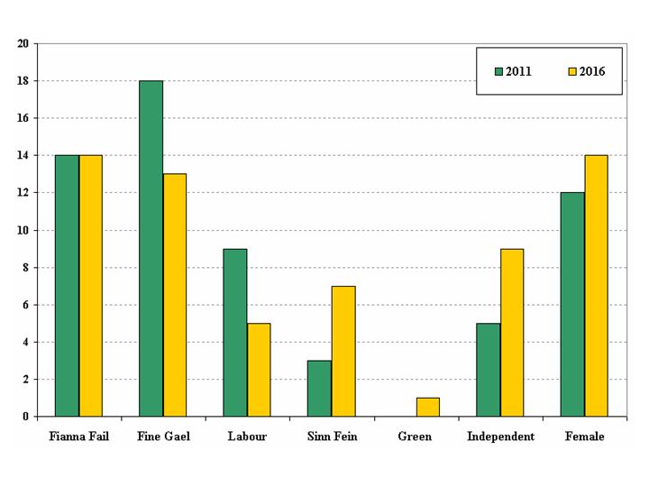 Figure 1: Number of seats won by political parties/groups and by female candidates at 2011 and 2016 Seanad Elections