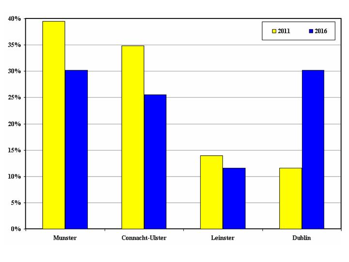 Figure 2: Percentage of seats won in Seanad vocational panel elections (2011 and 2016) by region