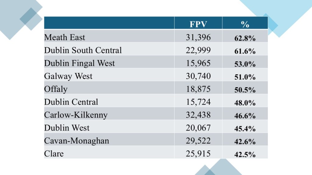 Here are the ten constituencies that were the most successful constituencies (as ranked by vote share) for female candidates at the 2024 General Election. Women won more votes than men in just five of the forty three constituencies being contested at this election. Nationally, female candidates won 31.7% of the overall first preference votes cast at this election. It’s obviously far from a 50-50 split in terms of a gender voting breakdown, but it is a vast improvement on how things stood at the 2011 General Election, where women accounted for only 15.2% of the candidates. The level of change over the past decade and a half has been driven by the introduction of a gender quota, in the wake of that 2011 election contest, with political parties standing to lose half of their state funding if they fail to achieve the gender quota target (and political parties in the Republic of Ireland are very much reliant on this state funding(. The quota was initially set at 30% (as used at the 2016 and 2020 elections), but the legislation made provisions for this to increase to 40% within seven years of the first general election at which the quota was used (i.e., from 2023 onwards) and the 40% gender quota target was in place for the first time at the 2024 General Election.